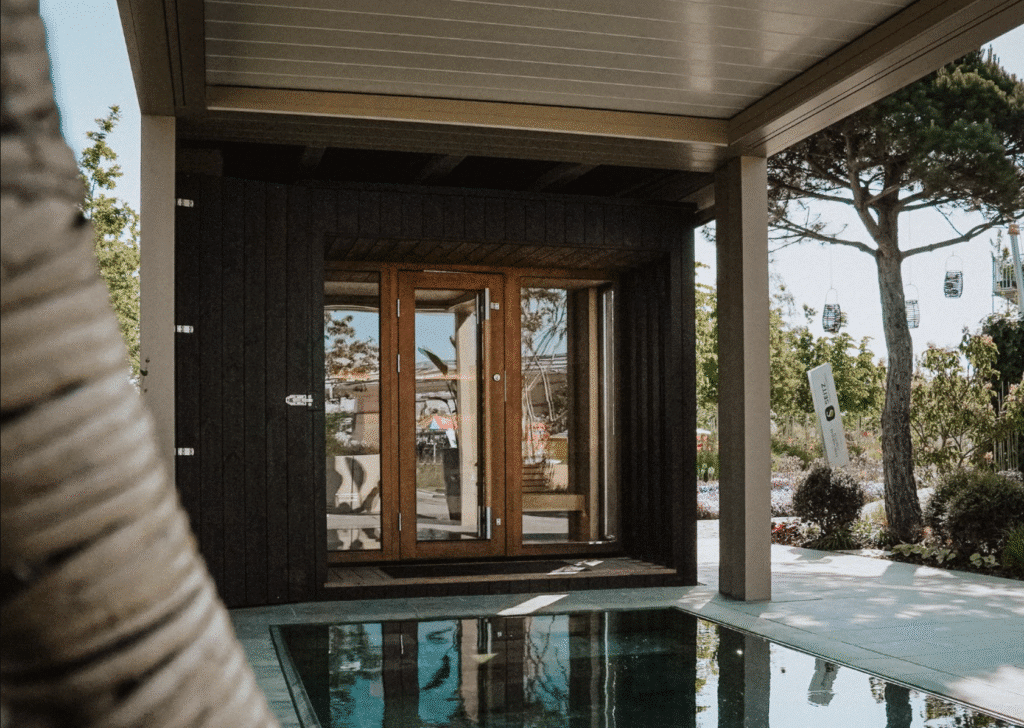An outdoor sauna with an extended terrace area, offering added space and a seamless indoor-outdoor layout with a modern, open feel.